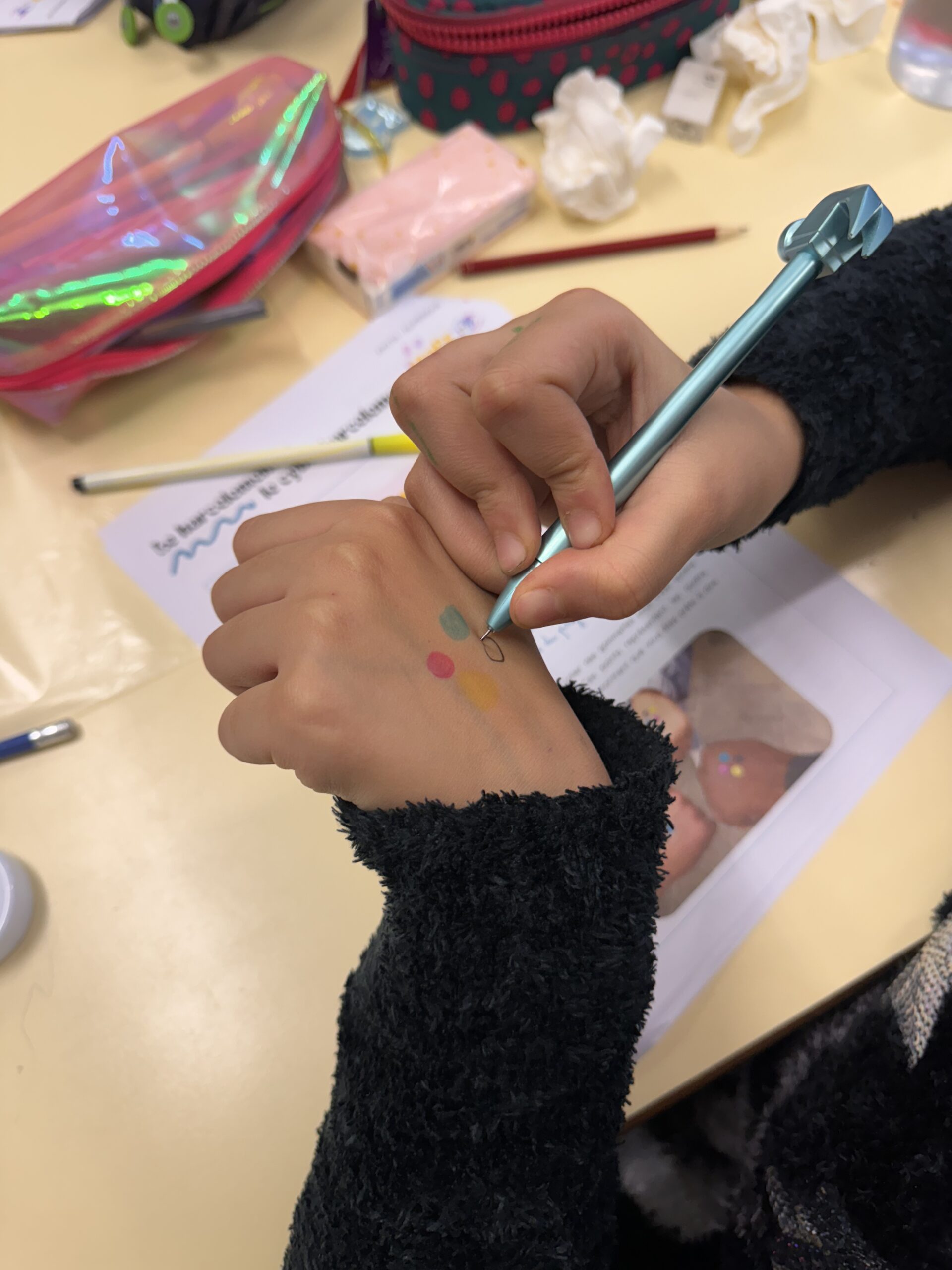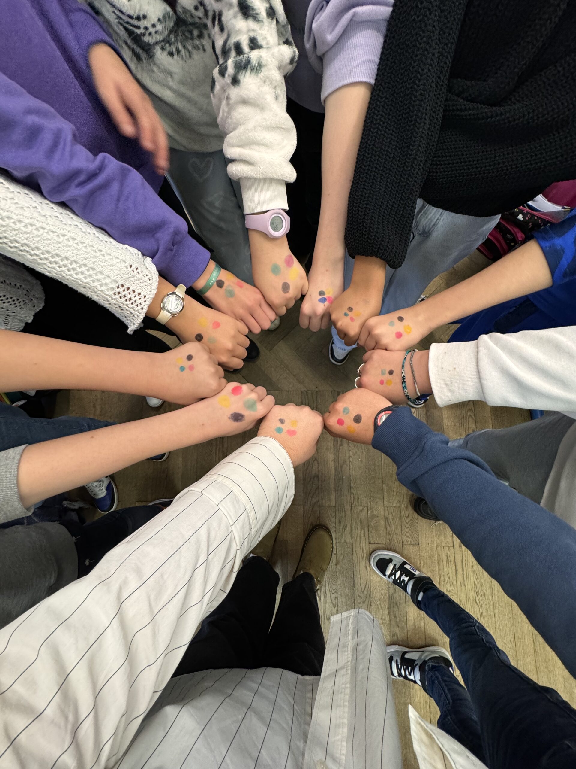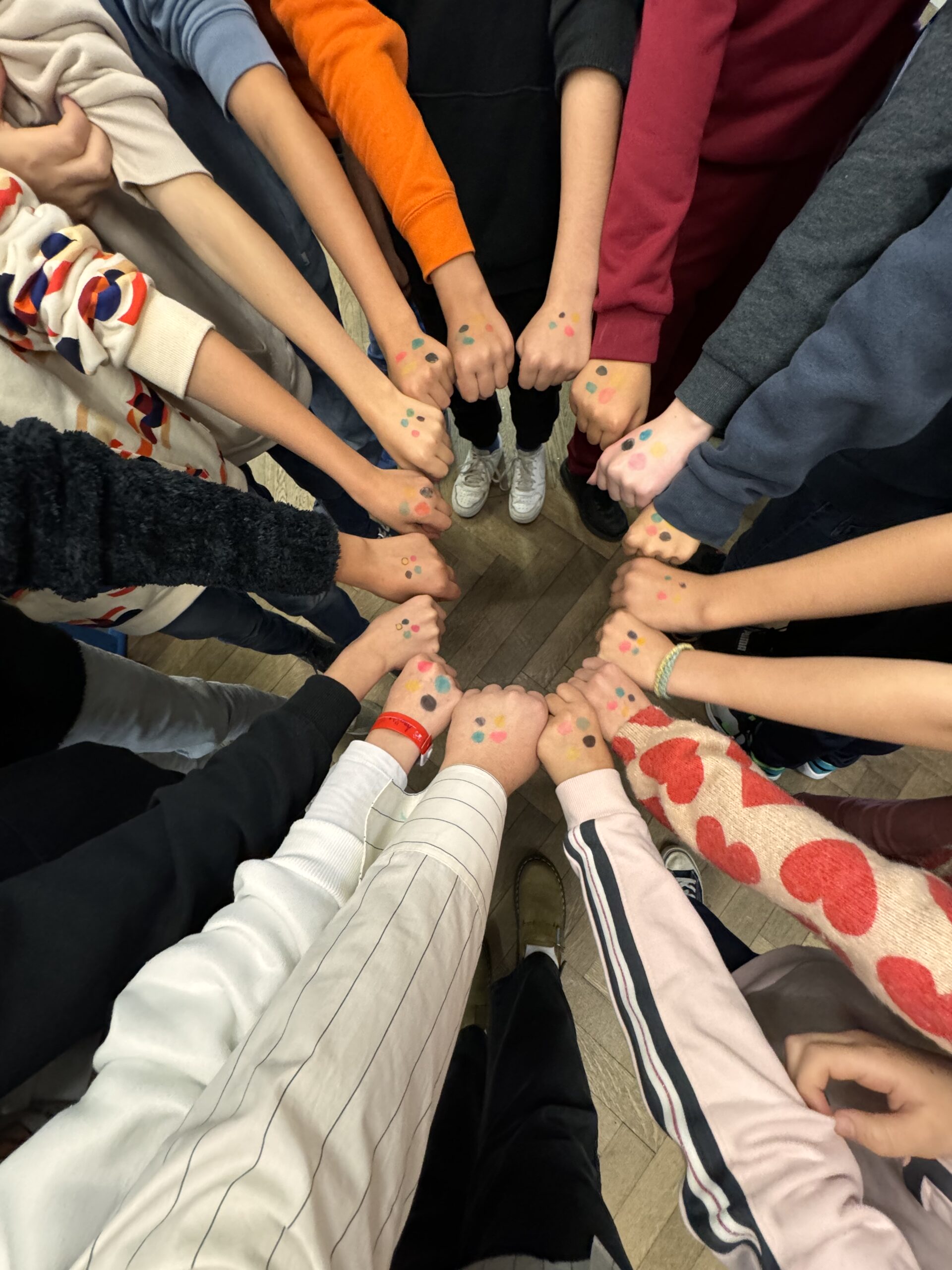 Chaque élève de P5 et P6 a marqué son engagement en dessinant les quatre points colorés du Projet HOPE sur sa main.