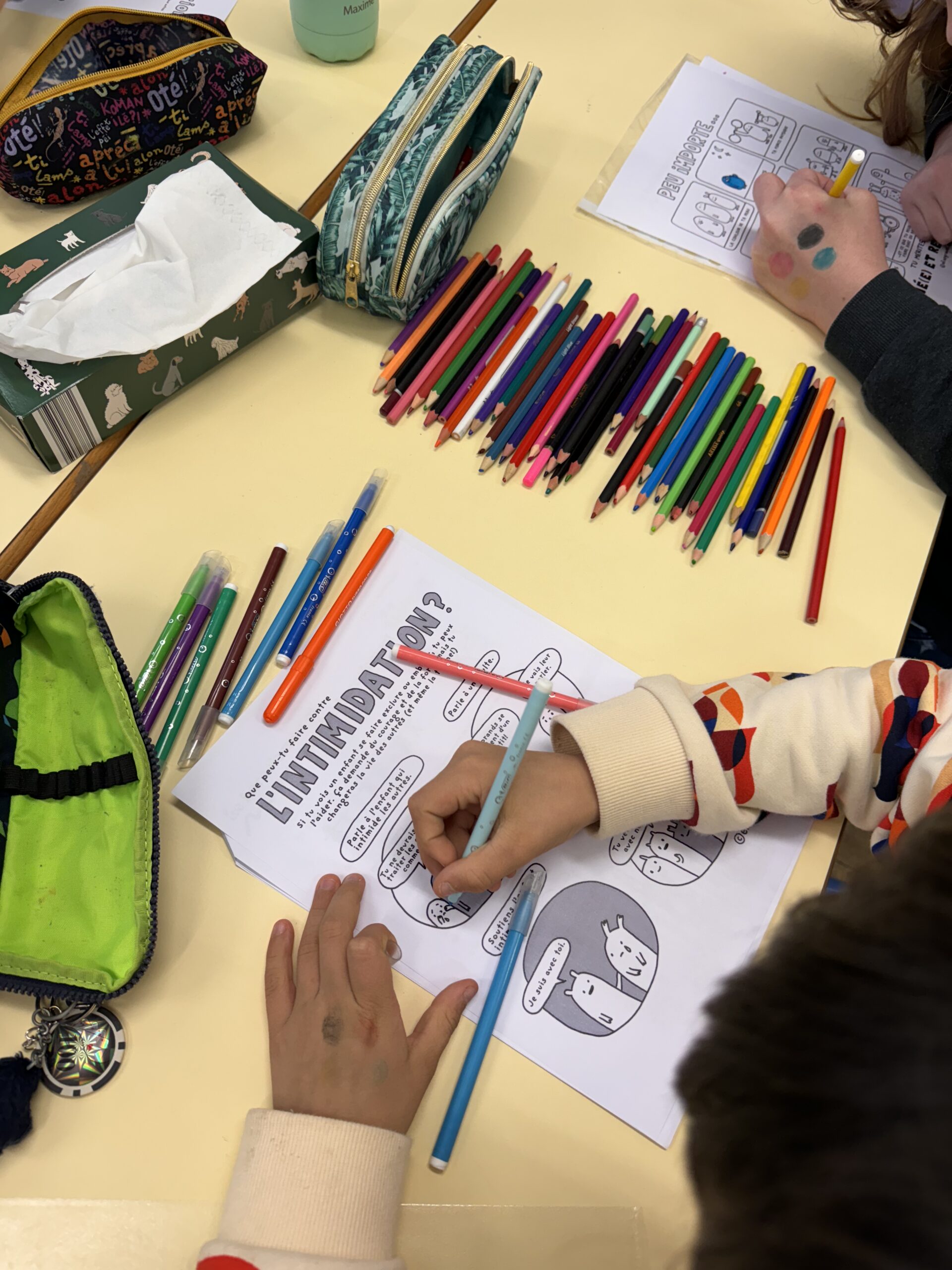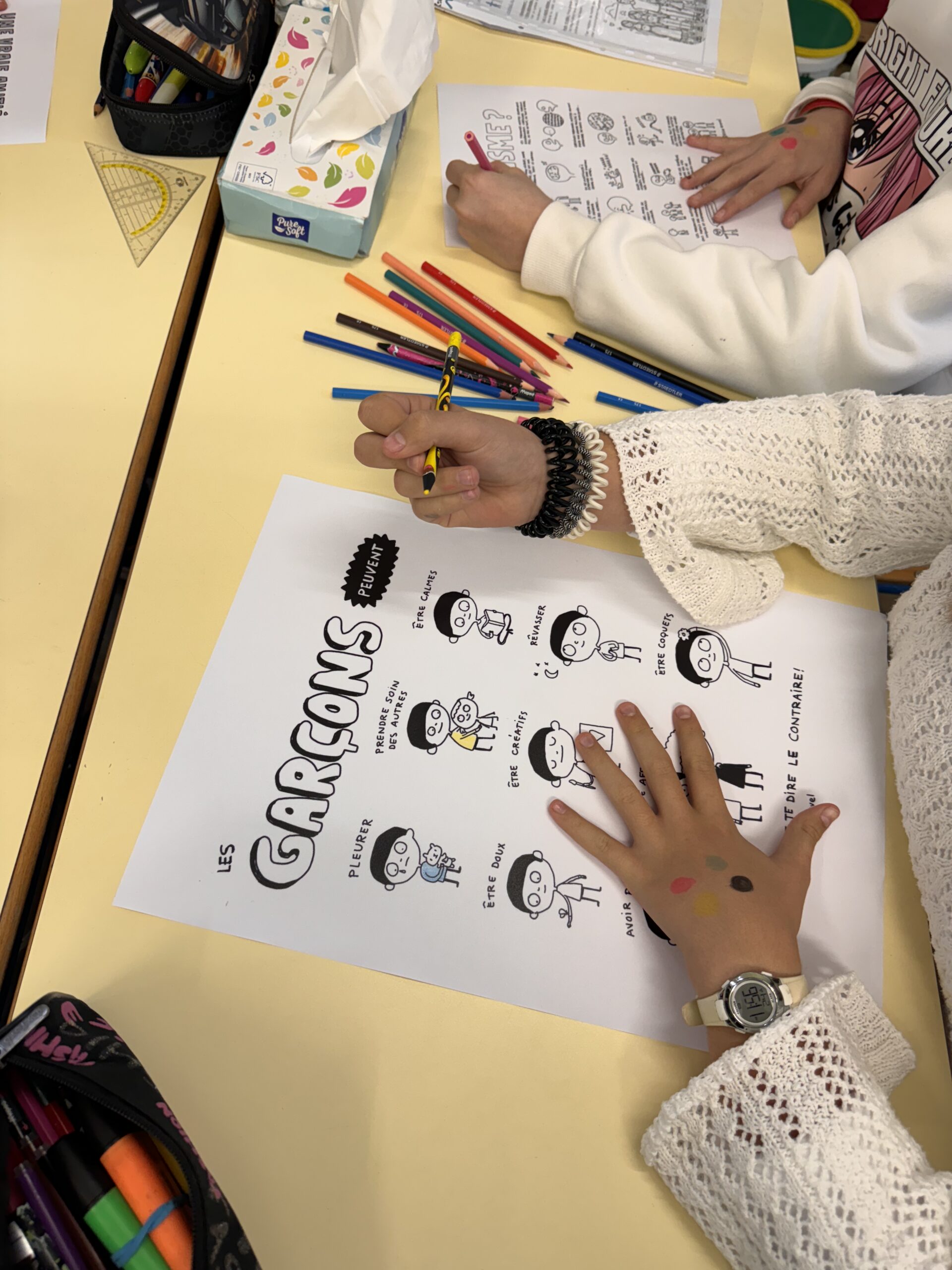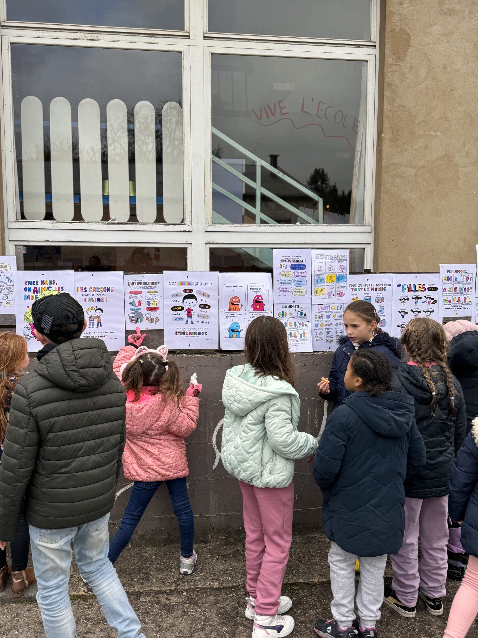 Les élèves ont également travaillé sur des affiches réalisées par l’illustratrice Elise Gravel. Ces œuvres, abordant des sujets comme la discrimination, l’acceptation de l’autre, et la lutte contre les stéréotypes, seront affichées dans toute l’école pour inviter à la réflexion collective.